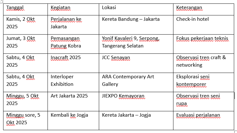 - Tujuan: Pemasangan Patung di Serpong, Menghadiri Inacraft & Art Jakarta, serta Kunjungan Galeri Seni