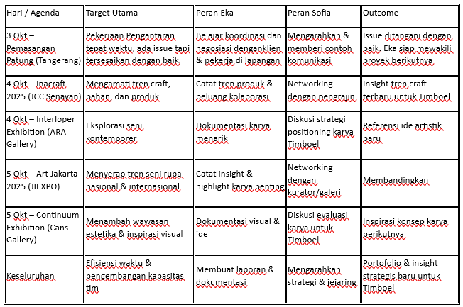 | 4 Okt β Inacraft 2025 (JCC Senayan) | Mengamati tren craft, bahan, dan produk | Membuat catatan tren produk & peluang kolaborasi | Fokus networking dengan pengrajin/brand | Insight tren craft terbaru untuk Timboel |