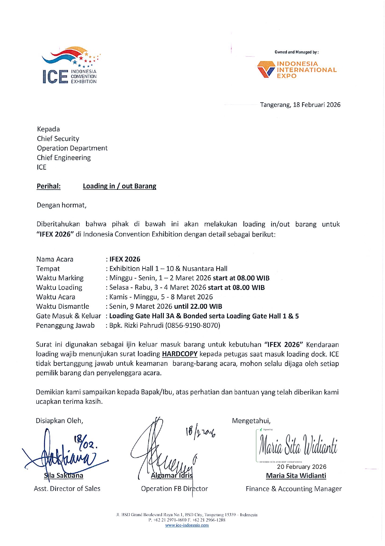 - Berangkat sampai ICE BSD tanggal 2 Maret pagi hari pukul 04:00.
