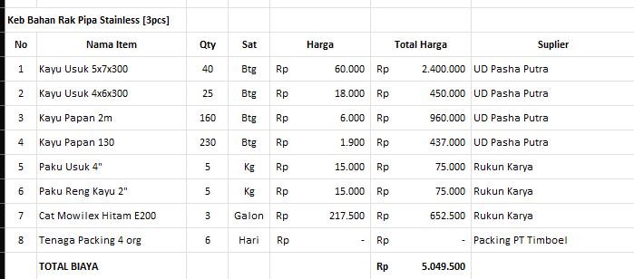 - what/apa: buat rak penyimpanan untuk material di gudang
